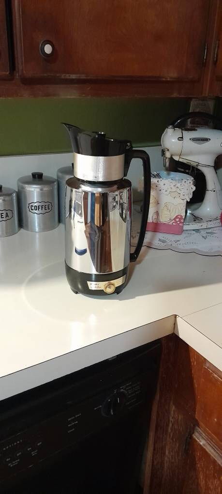 Iconic 1970s percolator made by Cory Corp. Makes 6 to 18 cups of wonderful perked coffee. light weight, they used chromed plastic around the outside. It is insulated to help keep warm but it does have a keep warm heater. Light comes on when the perk is done and you can adjust the strength with the dial on the side. It perks to 202 degrees on the "dark" setting which about perfect for hot brewed coffee.